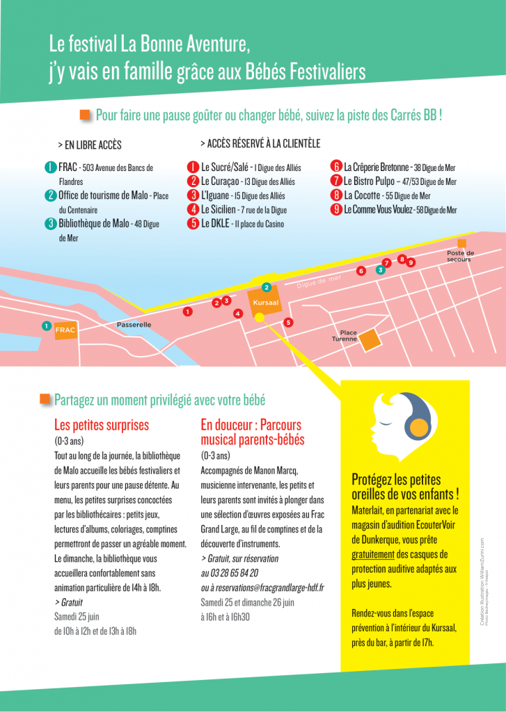 Tout au long de la journée, la bibliothèque de Malo accueille les bébés festivaliers et leurs parents pour une pause détente. Au menu, les petites surprises concoctées par les bibliothécaires : petits jeux, lectures d’albums, coloriages, comptines permettront de passer un agréable moment.